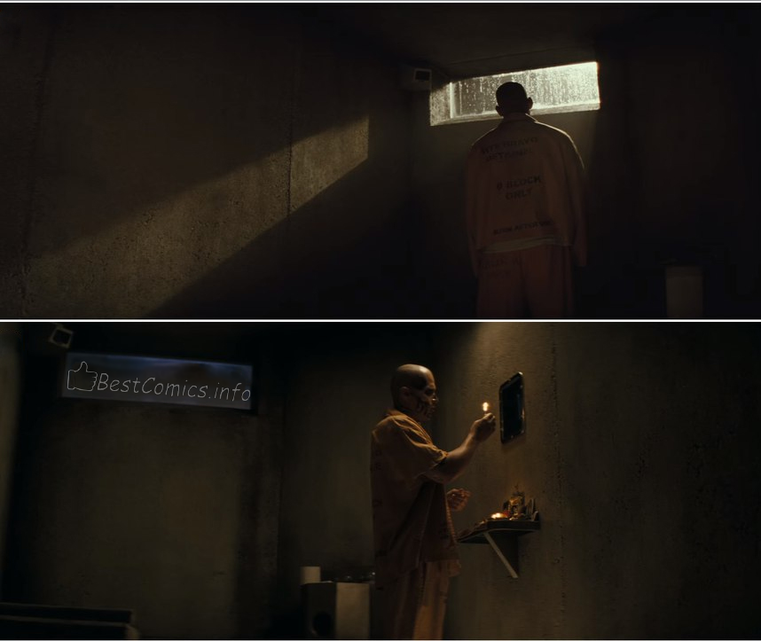 - Да и после самого падения была сцена, где Джокер с обожженным на половину лицом просит Харли сбежать, а та в свою очередь отказывается. После этого он взрывает дымовую гранату и сбегает. И да, кусок этой сцены вы могли увидеть в одном из трейлеров.