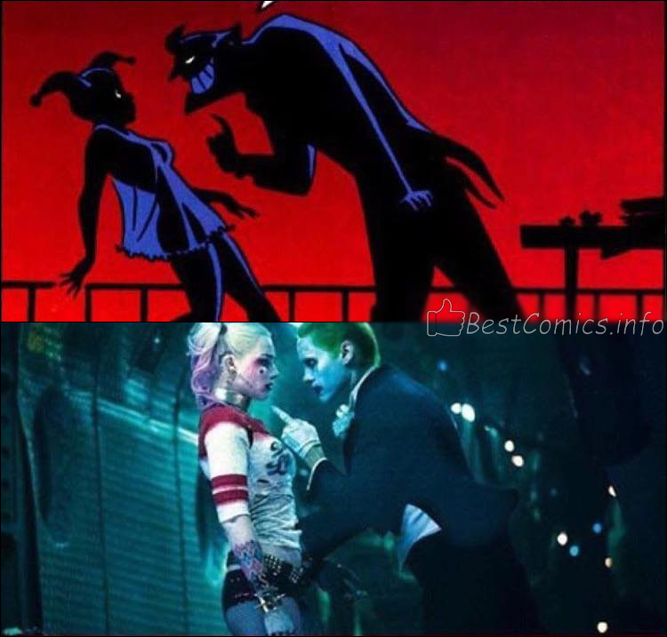 - Существовала и сцена драки Харли Квин с Джокером, по итогам которой Харли направляла на Джокера пистолет, после чего последний пытается успокоить возлюбленную, даёт ей пощечину и в итоге целует её.